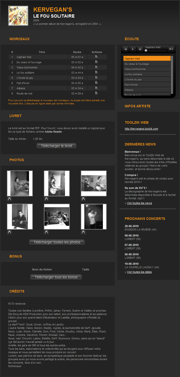 Une fois inscrit sur ToolZik, un artiste peut facilement éditer et personnaliser son ToolZik Web (cf. page dédiée). Celui-ci comporte entre autres une rubrique "Discographie" qui lui permet de mettre en ligne son catalogue de titres. L’opération est très simple et se réalise en quelques clics.