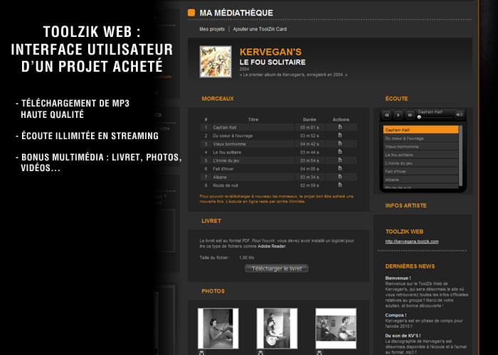 Via la rubrique "Discographie" de leur ToolZik Web, les artistes peuvent proposer en téléchargement payant leur catalogue de titres. La mise en ligne se fait en quelques clics.
