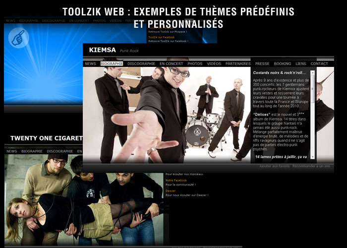 Là où les réseaux sociaux traditionnels (Myspace, Facebook…) imposent une mise en forme rigide et peu artistique, le ToolZik Web s’inscrit dans une démarche totalement différente en proposant aux artistes de personnaliser l’apparence de leur site en quelques clics. L’ergonomie du site et l’agencement des rubriques ont été étudiés de telle sorte que la seule personnalisation du fond de chaque page suffise à identifier chaque ToolZik Web.